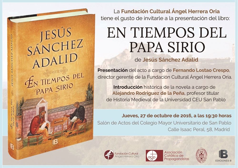 Presentación de la nueva novela de Jesús Sánchez Adalid, «En Tiempos del Papa Sirio» en el Salón de Actos del Colegio Mayor Universitario de San Pablo, organizada por la Fundación Cultural Ángel Herrera Oria.